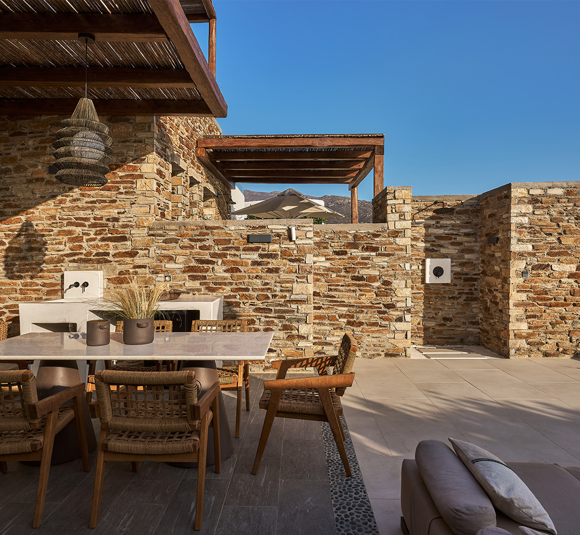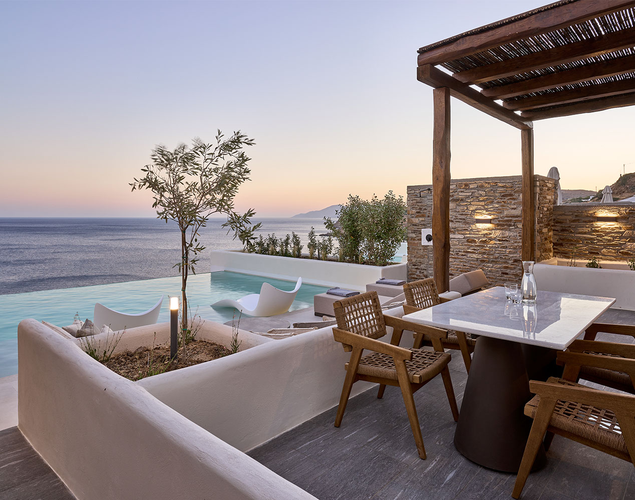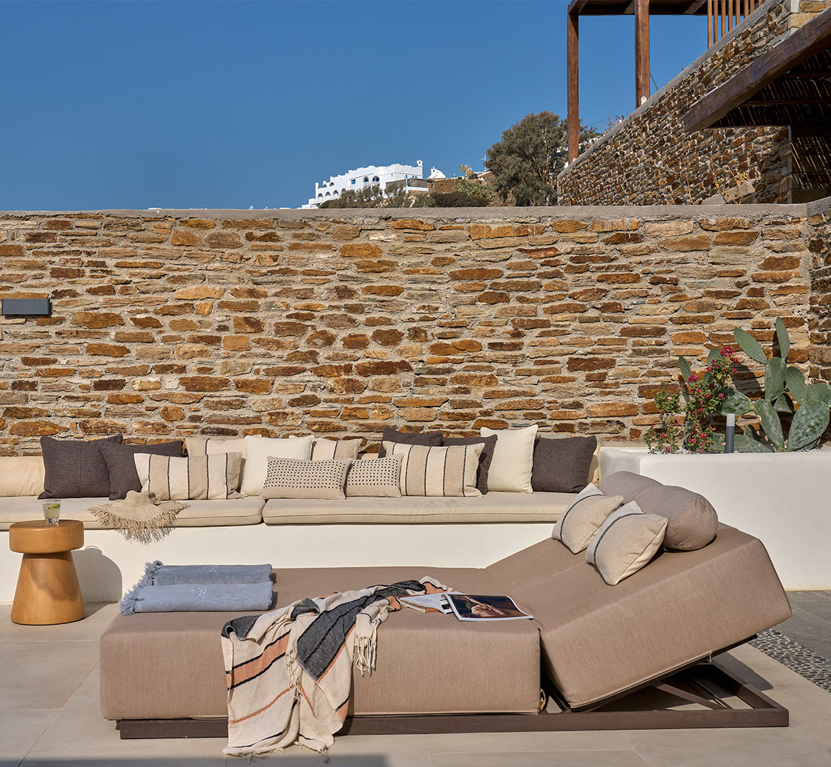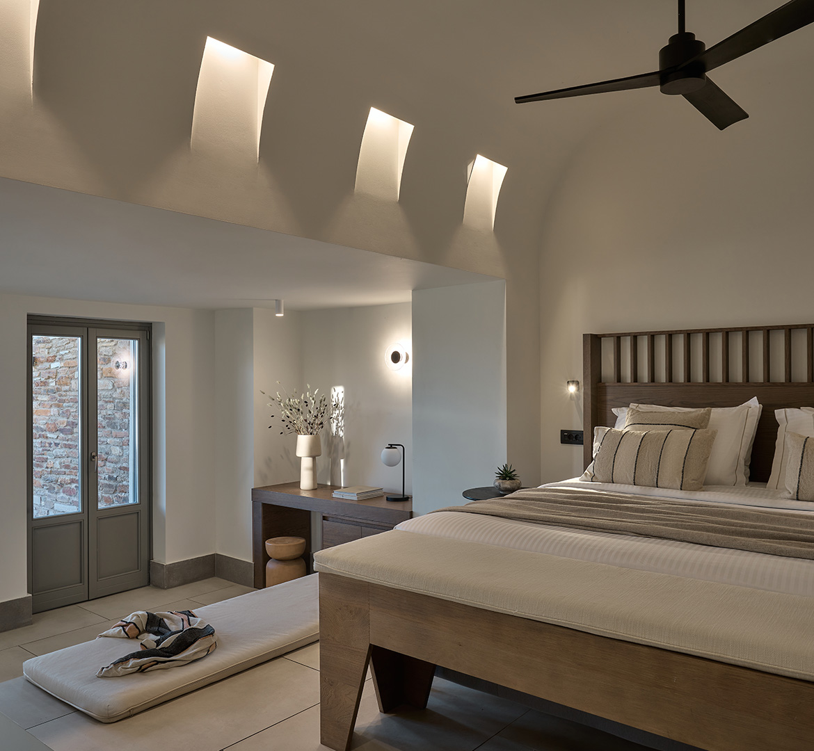 Outdoor Edge Living Project lives on the island of Ios in the Cyclades. The name of the island is said to come either from the characteristic flowers Ia, or from the Phoenician word Ios, which means pile of stones. The design is adapted, harmonized and at the same time inspired by the plasticity and austerity of the Cycladic architecture. The aim of the project is its integration in the special place and the emphasis on outdoor living. The twelve suites are located based on their optimal orientation to the unobstructed view of the Aegean Sea. The main tools of the synthesis are the light, the shadow, the Cycladic white, the use of natural materials and contrasts, in order to provide a modern and yet calm and intimate environment with a high degree of privacy during the stay. The historicity of Cycladic culture is reflected in interior design and attributes to it architectural forms, such as arches and forms inspired by cycladic art.