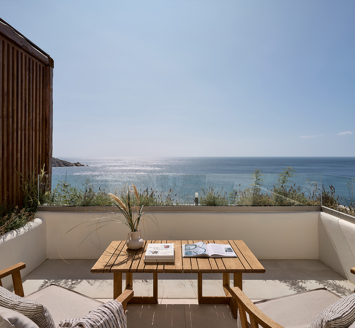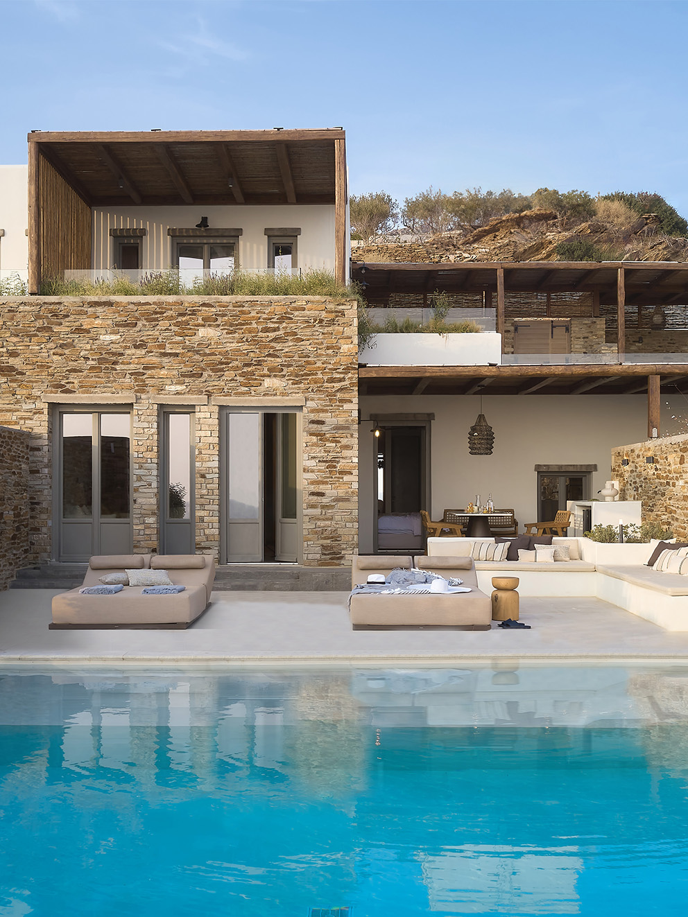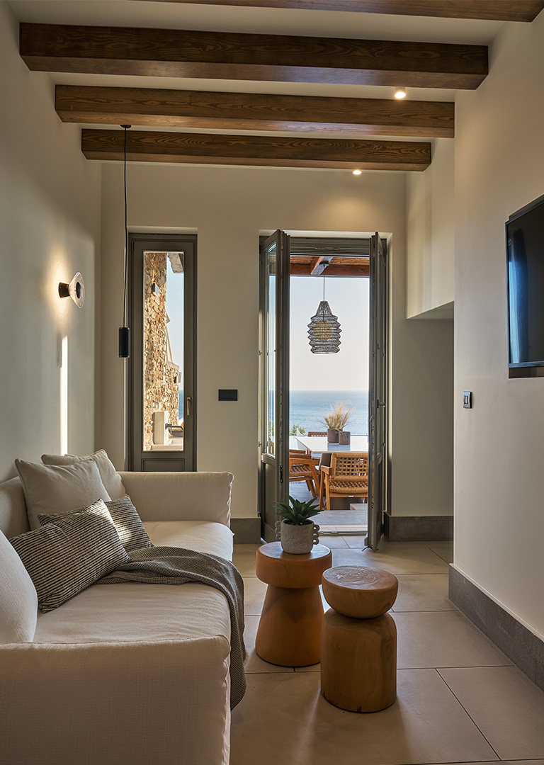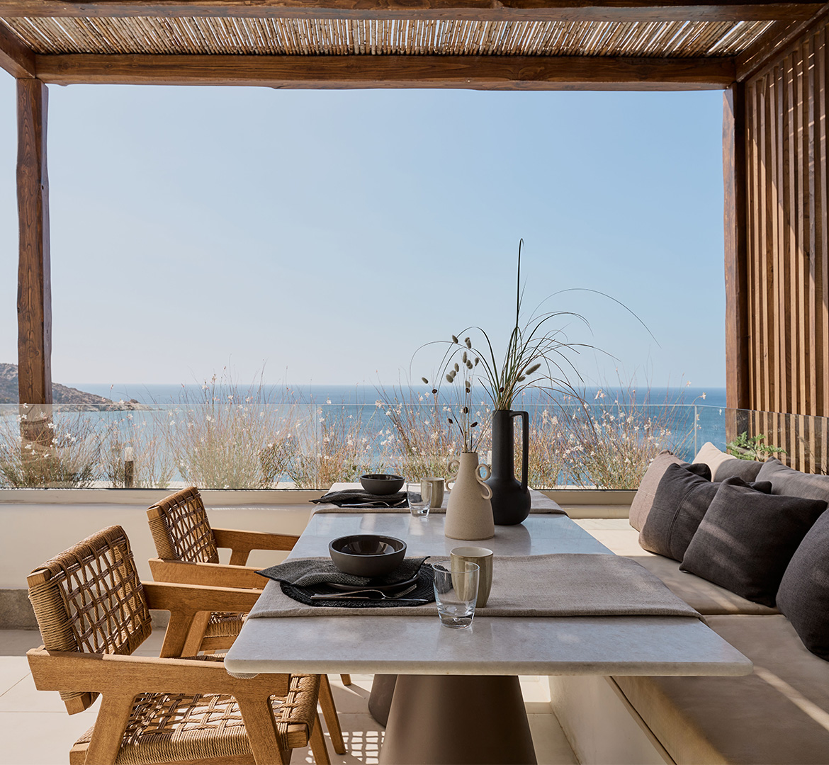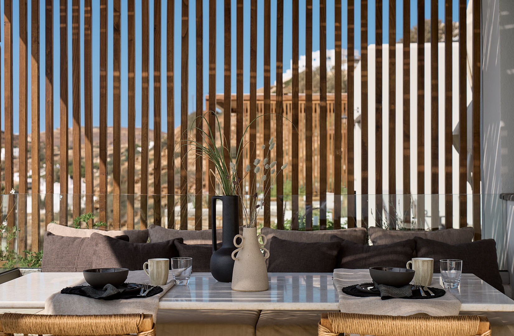 Outdoor Edge Living Project lives on the island of Ios in the Cyclades. The name of the island is said to come either from the characteristic flowers Ia, or from the Phoenician word Ios, which means pile of stones. The design is adapted, harmonized and at the same time inspired by the plasticity and austerity of the Cycladic architecture. The aim of the project is its integration in the special place and the emphasis on outdoor living. The twelve suites are located based on their optimal orientation to the unobstructed view of the Aegean Sea. The main tools of the synthesis are the light, the shadow, the Cycladic white, the use of natural materials and contrasts, in order to provide a modern and yet calm and intimate environment with a high degree of privacy during the stay. The historicity of Cycladic culture is reflected in interior design and attributes to it architectural forms, such as arches and forms inspired by cycladic art.